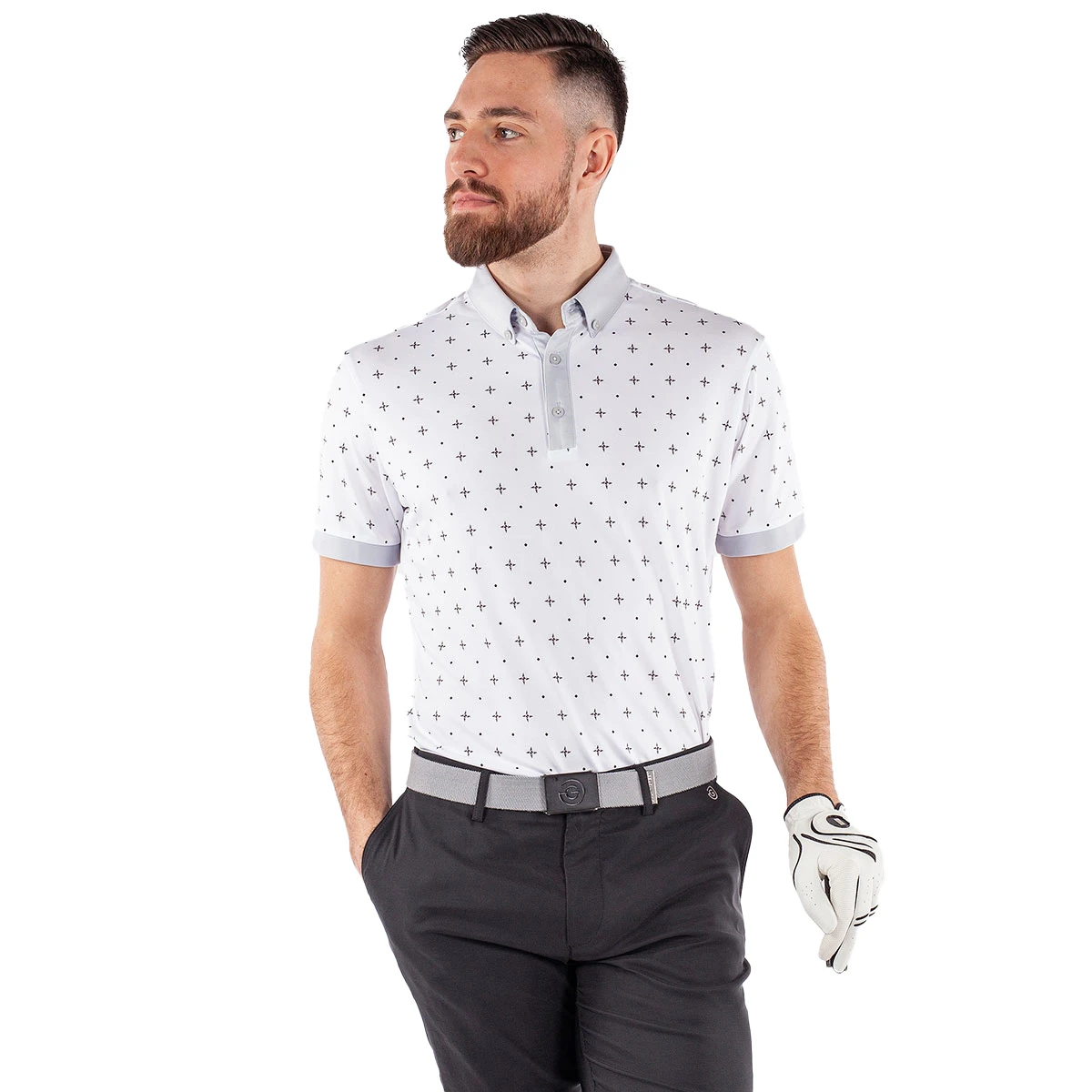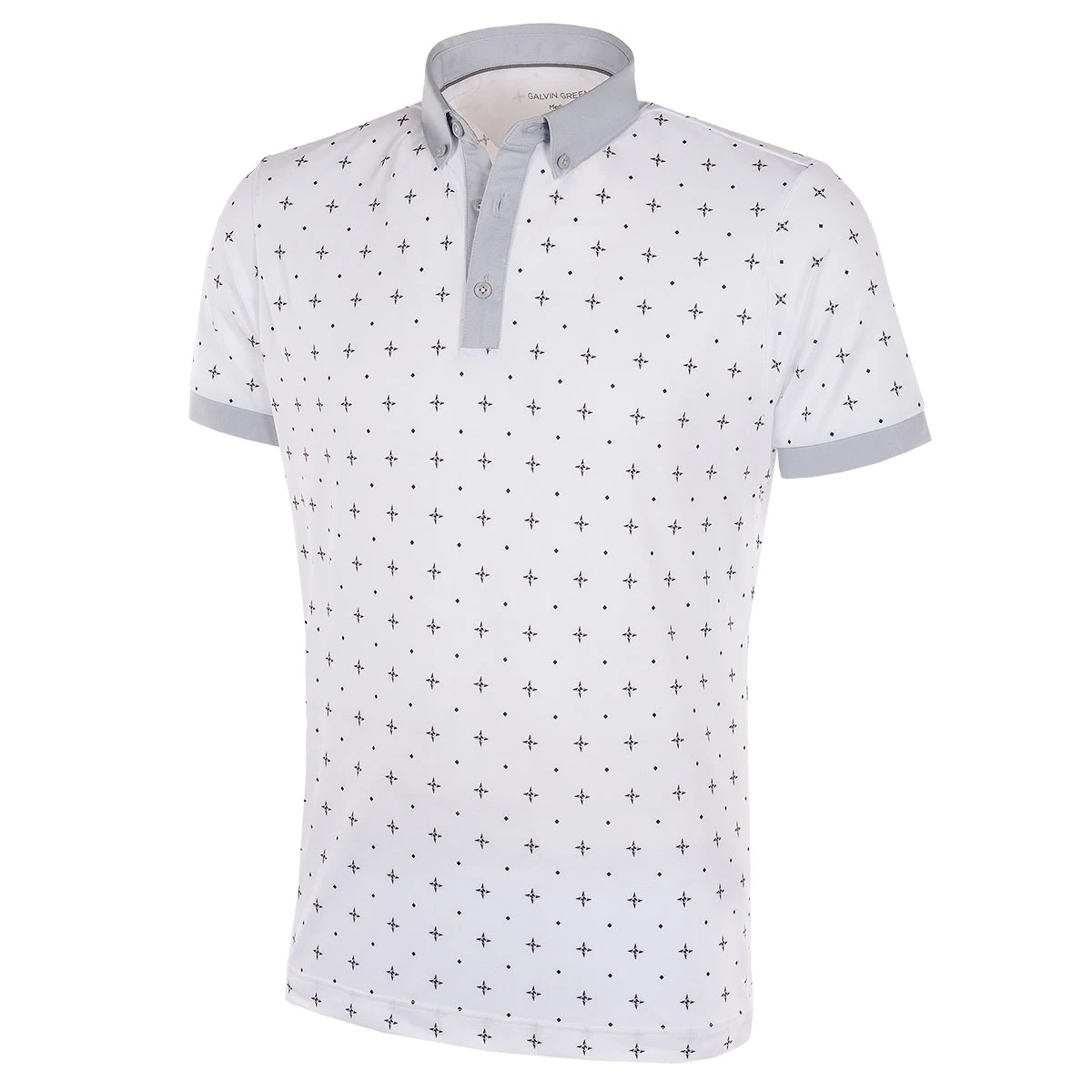 The Marlow polo shirt is made with VENTIL8™PLUS fabric, and highlighted with a fully printed design inspired from pixels made into flowers. Finer details include a fold-over collar and a button placket in contrasting colour, open sleeve cuffs, and highlighted further with a rubber Galvin Green logo on the left sleeve.