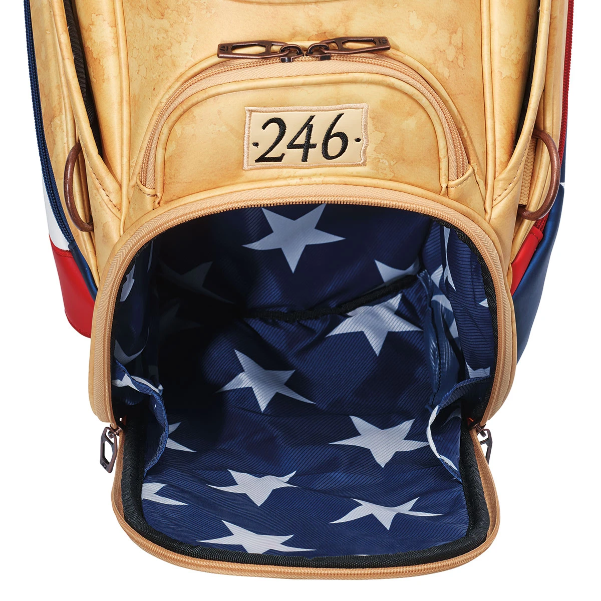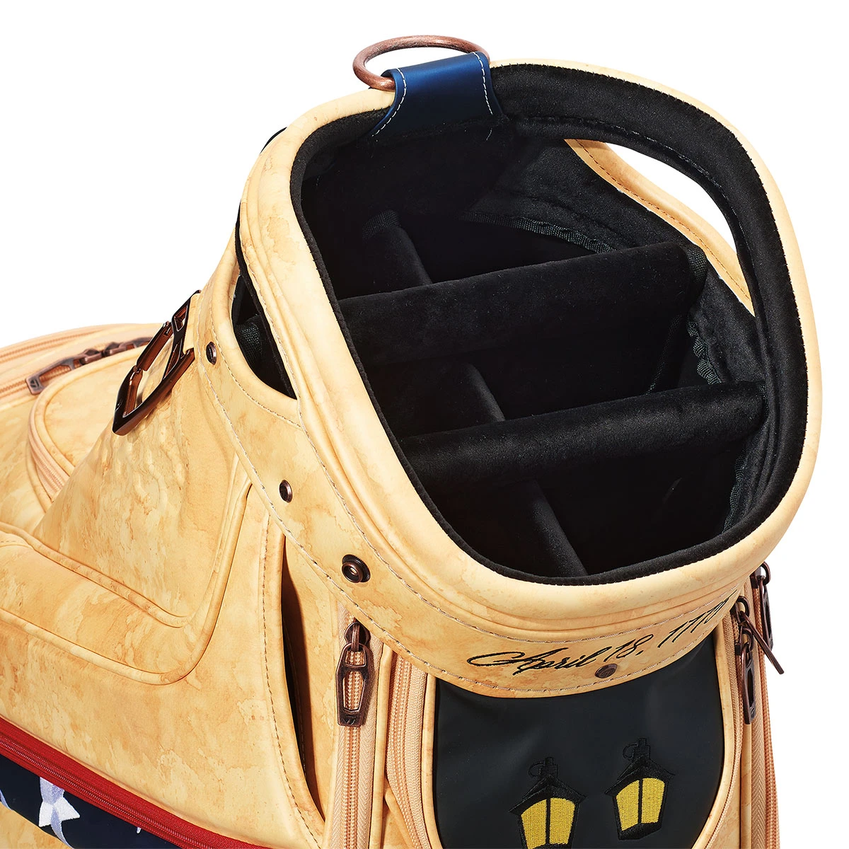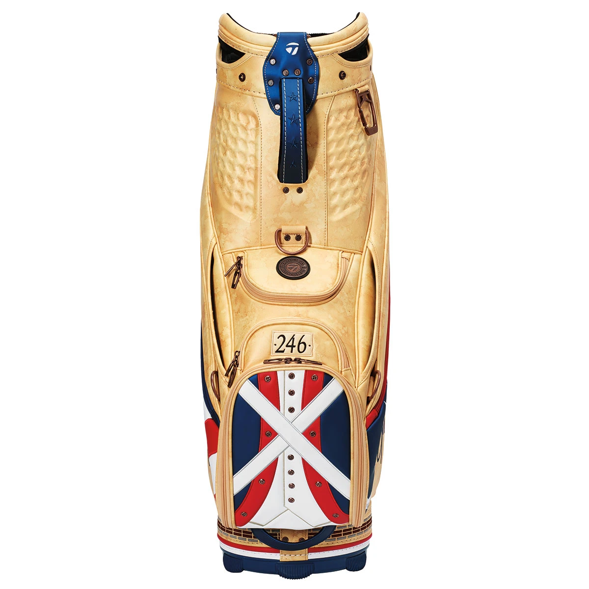 Following the historical timeline, the ball pouch was inspired by the uniforms worn by American patriots during the ensuing Revolutionary War. The rivets are made from brushed bronze and have subtly placed TaylorMade logos. Venue-inspired features include the “246” in the upper pocket as a nod to the 1913 champion, Francis Ouimet, who lived on the 17th hole at 246 Clyde Street. The house still stands to this day, with the championship returning to the historic country club for the fourth time. A hard-wearing medallion and bricks around the base pay homage to the Freedom Trail, marked by 16 historical locations throughout Boston. While the frosty beer glass is a nod to one of the region’s most recognizable breweries.